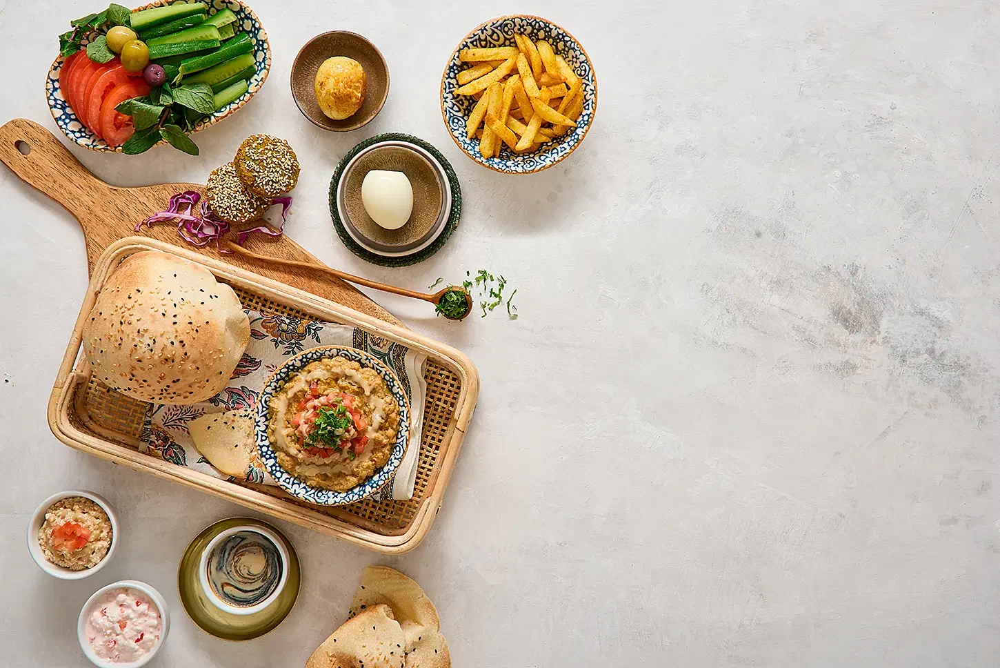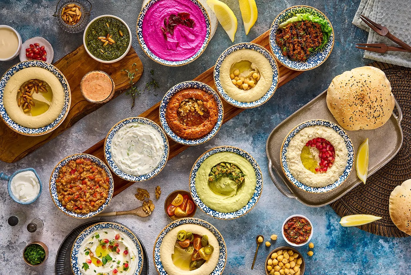 over a dozen preparations: classic hummus, vivid pink beetroot labneh, slow-roasted mutabbal, fresh