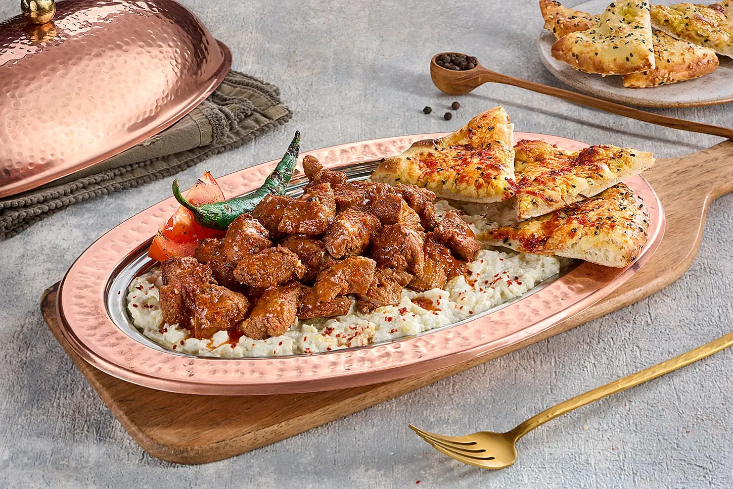 served with freshly baked pide, was captured mid-reveal, with the ornate copper lid placed to one side